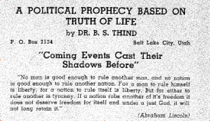 “A Political Prophecy Based on Truth of Life” is a very special two page booklet Dr. Thind published from Salt Lake City, Utah.